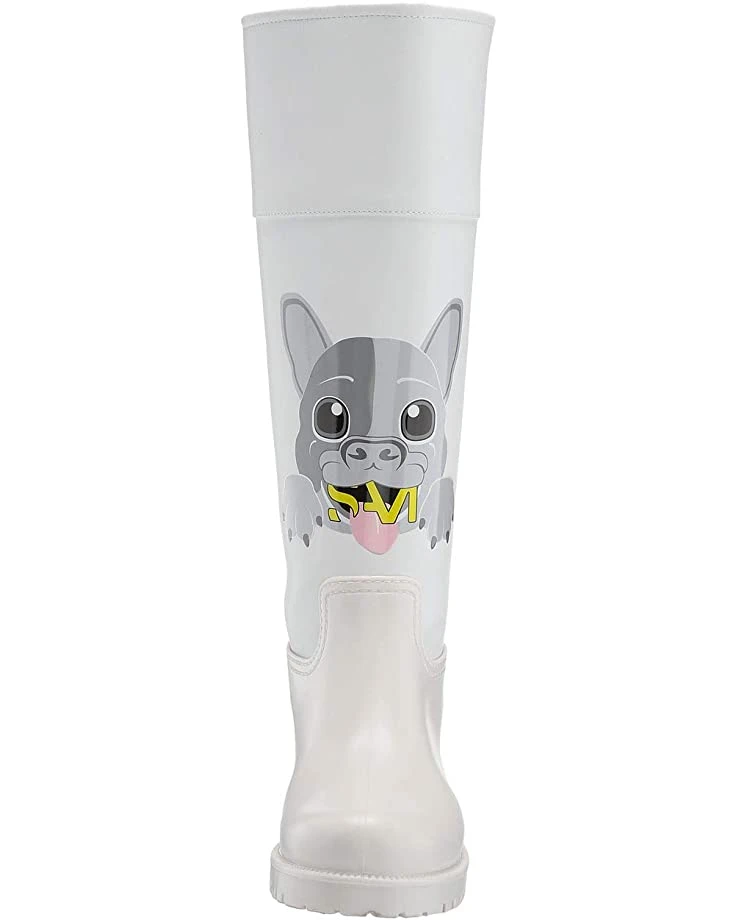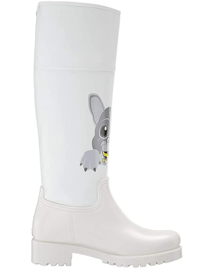 - Knee-high silhouette in a matte PVC upper featuring a puppy motif.