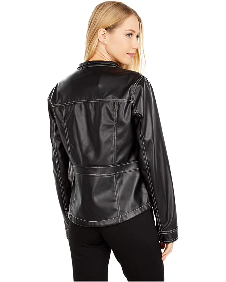- The Sam Edelman® Faux Leather Snap Front Jacket is sure to become a closet staple. The contemporary jacket is crafted from a faux-leather in a snap-front design.