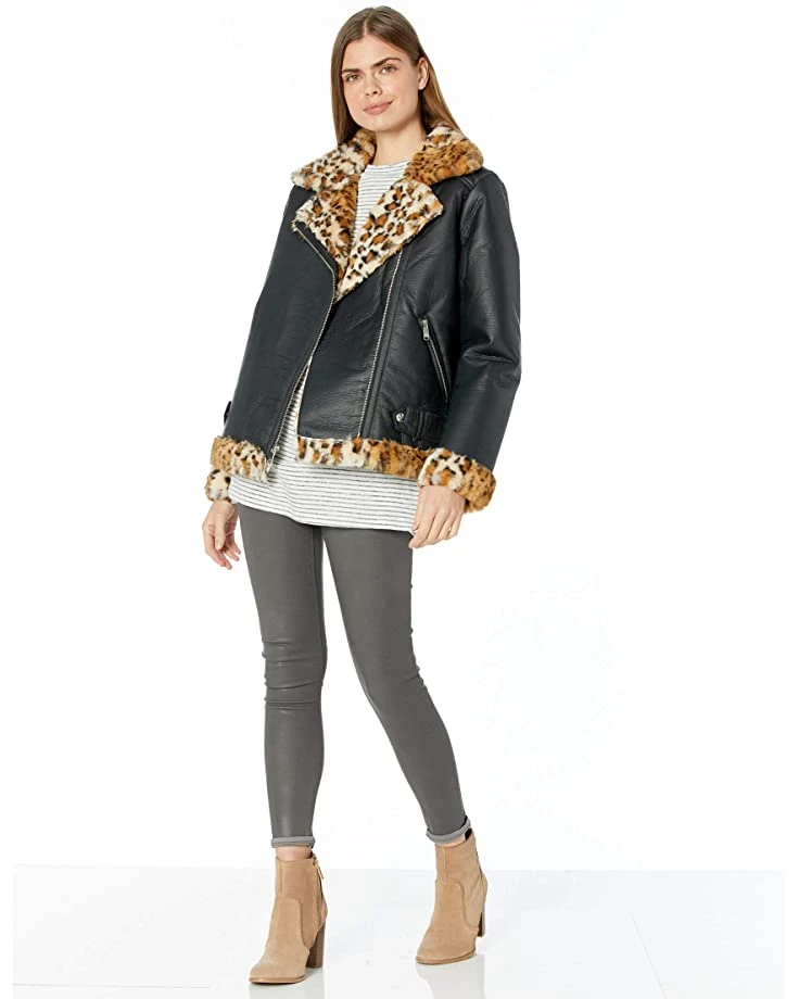- The Sam Edelman® Leopard Trim Bomber is an on-trend moto jacket with leopard-print faux-fur trim. The design is complete with a notch collar, long sleeves, asymmetrical exposed front zip, waist zip pockets, snap tab at waist, and a full lining.